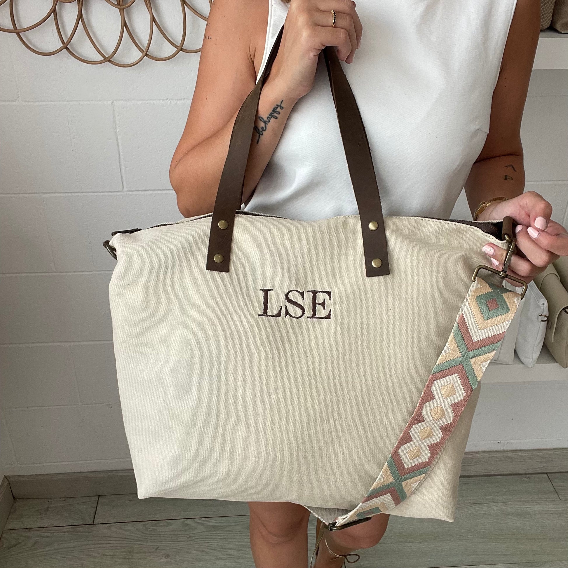 Nuestro bolso combinado piel y loneta personalizado, tiene un cuerpo confeccionado en lona de color, sus asas son de piel y una correa regulable para poder lucirlo como bandolera. Su cierre es con cremallera y todos sus detalles son en color cobre.